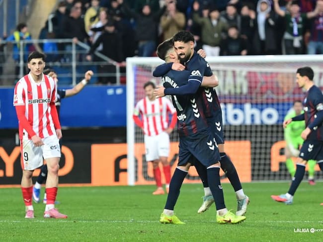 Los jugadores del Eibar celebran la victoria ante la desolación de los jugadores del Sporting. / LaLiga