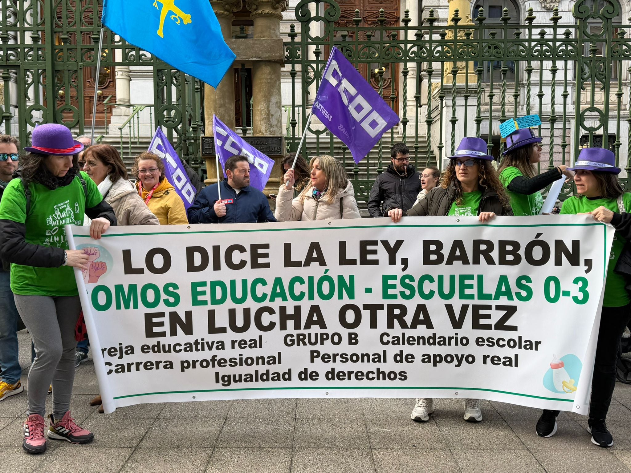 Las educadoras de las escuelas infantiles de 0 a 3 años protagonizaron esta mañana una concentración frente a la Junta General del Principado, coincidiendo con la primera jornada de huelga, que registró un seguimiento superior al 80% en la red autonómica y por encima del 90% en numerosos centros municipales. La movilización evidenció el respaldo del colectivo a un paro convocado para exigir mejoras laborales y el reconocimiento profesional.