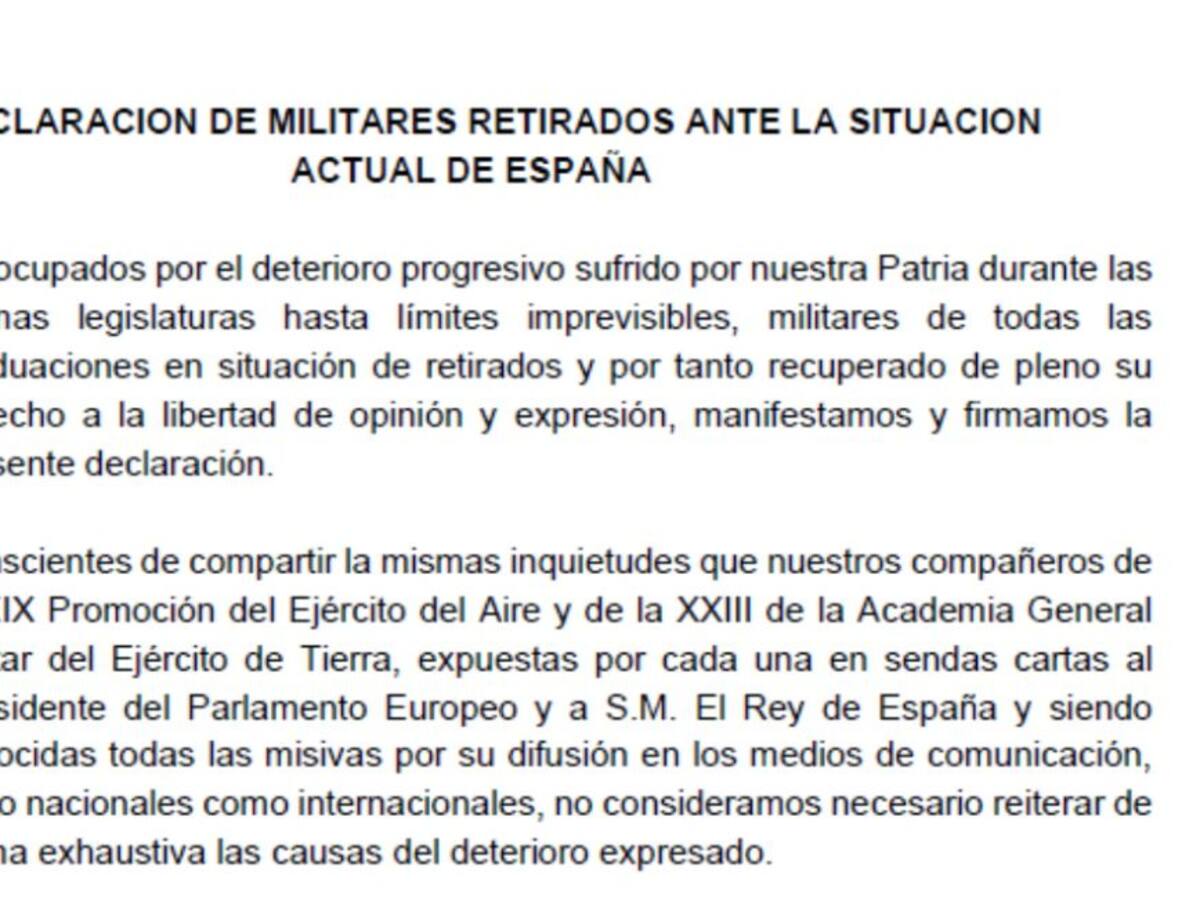 El documento al que ha tenido acceso la Cadena SER está encabezado por el teniente general Emilio Pérez Alamán y suscrito por generales, oficiales, legionarios y soldados Los firmantes aseguran su completa desvinculación y desagrado con el controvertido chat privado de militares retirados que es "ajeno a nuestro sentir y esencia de soldados" Además aseguran que el manifiesto continuará creciendo porque existe mucho malestar con la ministra Robles y con el Jemad por no "dejarles de hacer su libertad de expresión"