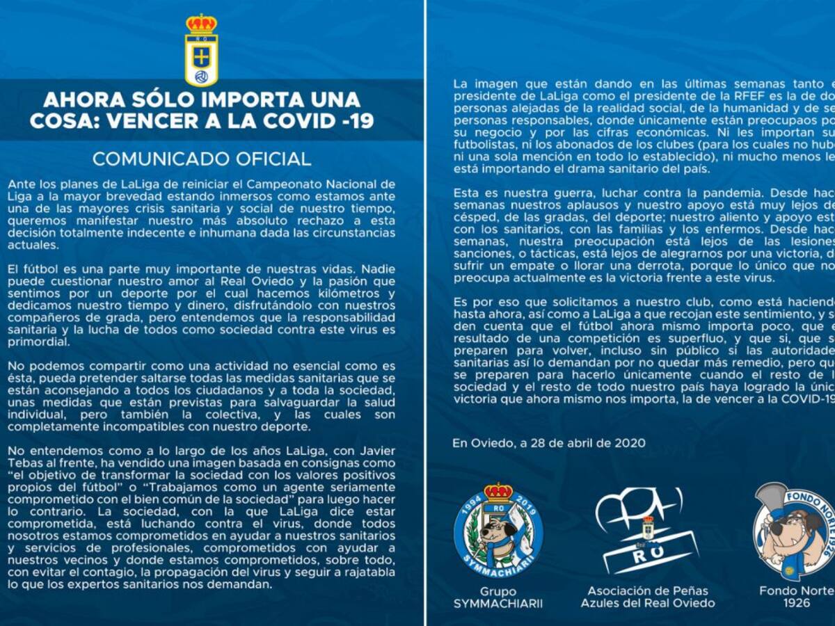 Symmachiarii, Fondo Norte 1926 y APARO firman un comunicado, junto a varias aficiones de España, manifestando su "absoluto rechazo" a la vuelta de la competición de forma inmediata.