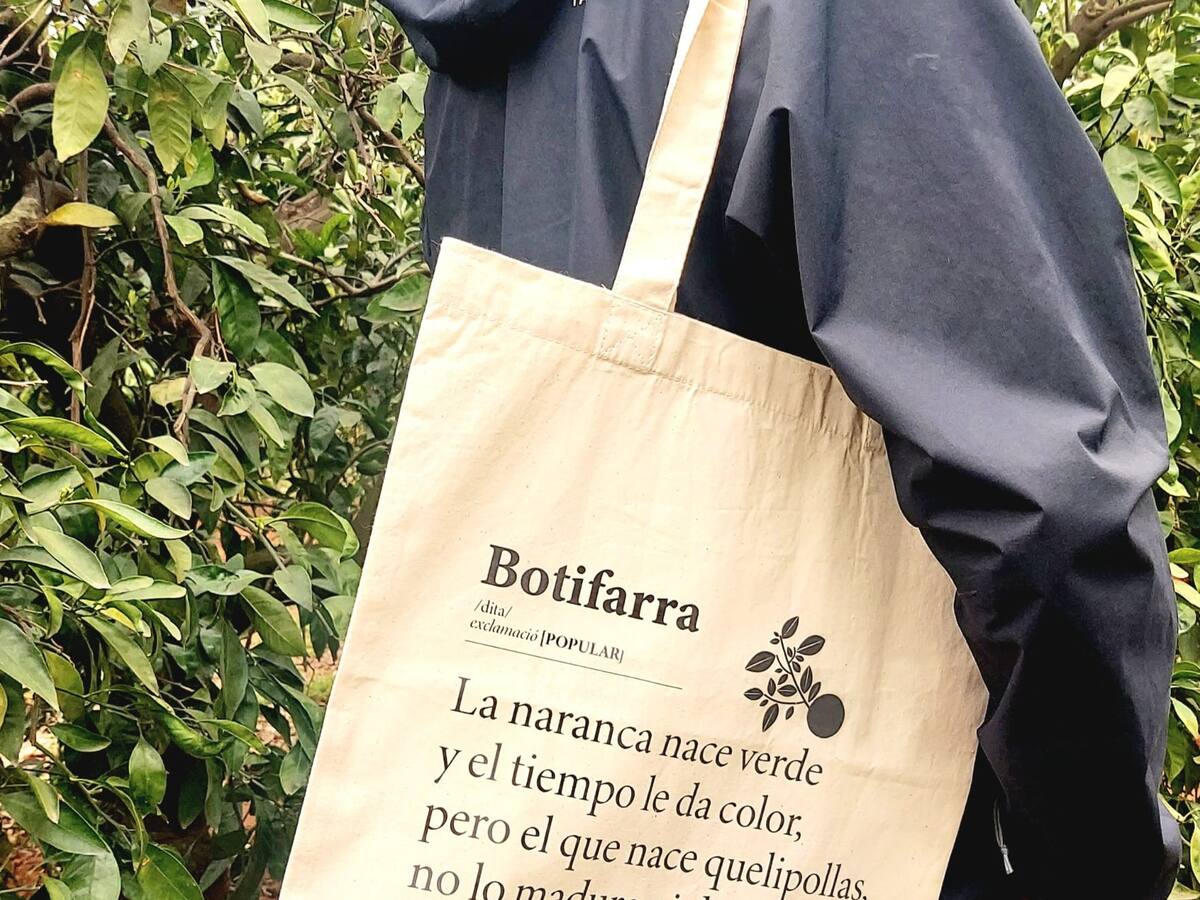 Pep Gimeno "Botifarra" ha puesto a la venta en su web una bolsa de algodón, a una tinta, con el texto “La Naranca nace verde, y el tiempo le da color, pero el que nace quelipollas, no lo madura ni dios"