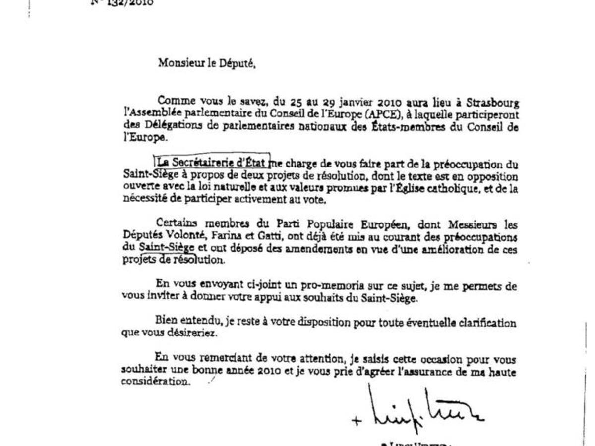 Una carta del nuncio en Francia, dirigida a los populares, transmite la preocupación de la Santa Sede sobre algunos proyectos que se votan en la Asamblea del Consejo de Europa