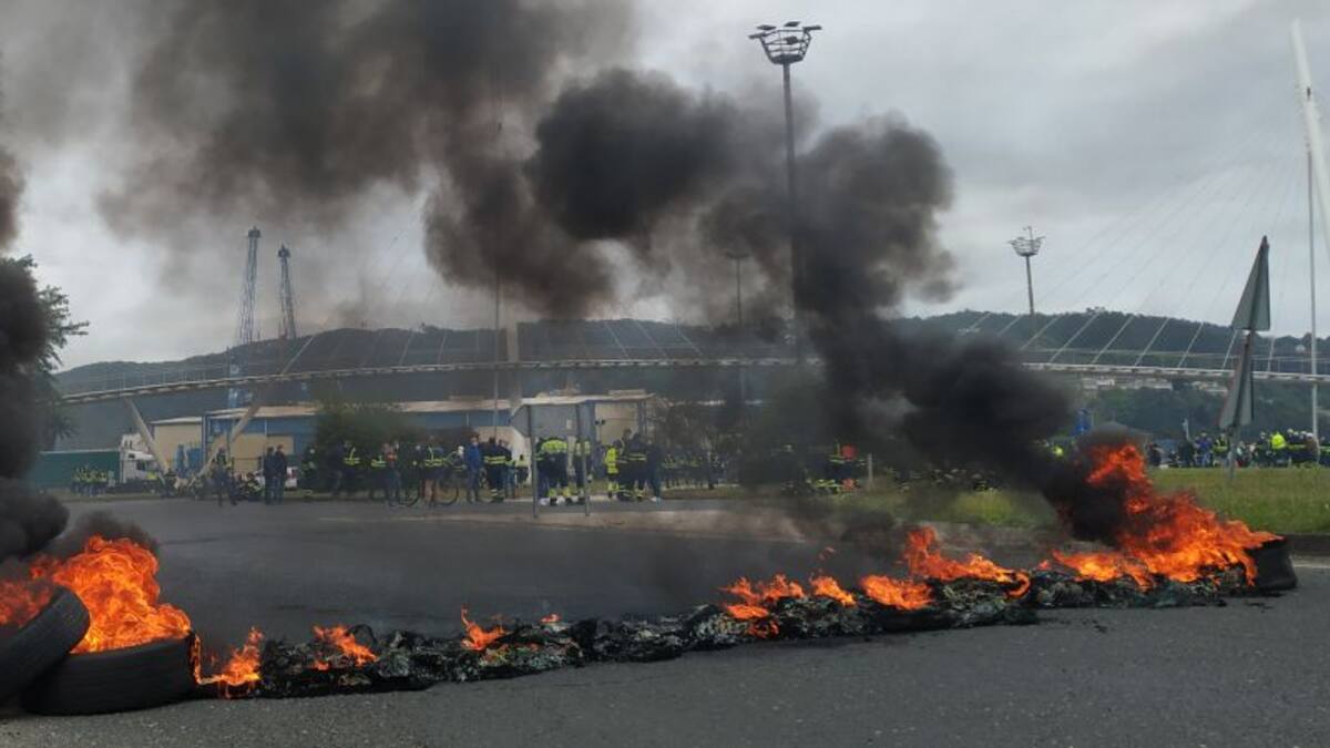 Neumáticos ardiendo y una larga columna de humo negro a las puertas del astillero de Navantia Ferrol para denunciar la crítica situación de los trabajadores de las auxiliares