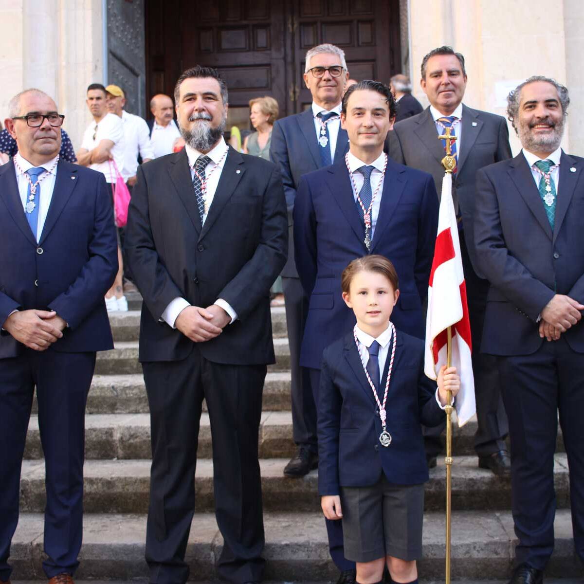 El capità cristià de la Filà Andaluces, Javi Ferrándiz, presenta la seua heràldica davant de la torre Na Valora