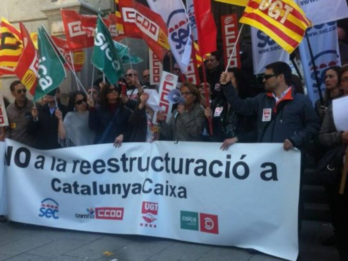 Els treballadors de CatalunyaCaixa, s'han concentrat aquest migdia davant de la seu del Banc d'Espanya a Barcelona per protestar pel pla de reestructuració que Brussel.les i el Govern espanyol volen imposar a l'empresa