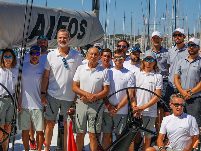 PALMA, 01/08/2022.- El rey Felipe VI posa con la tripulación del Aifos en el Real Club Náutico de Palma antes de participar en la 40 edición de la Copa del Rey de Vela, este lunes. EFE/ Copa del Rey MAPFRE/Nico Martínez SOLO USO EDITORIAL/SOLO DISPONIBLE PARA ILUSTRAR LA NOTICIA QUE ACOMPAÑA (CRÉDITO OBLIGATORIO) / Copa del Rey MAPFRE/Nico Martínez (EFE)
