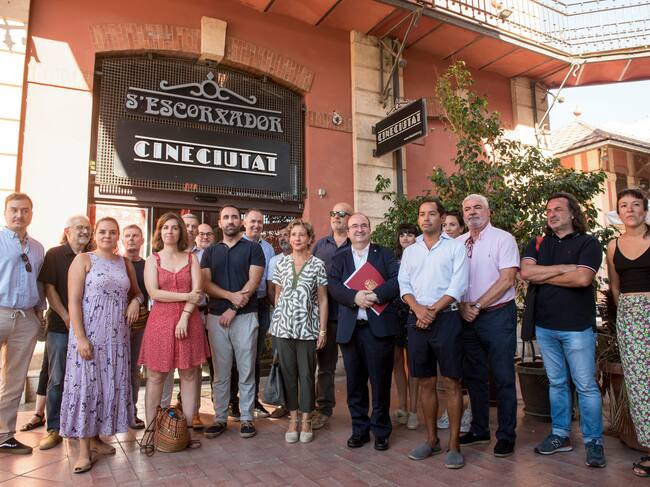 PALMA, 01/08/2022.- El ministro de Cultura, Miquel Iceta, que se ha reunido en CineCiutat (Palma) con representantes del sector cultural de Baleares, con quienes compartirá los avances alcanzados respecto al Estatuto del Artista y el Bono Cultural Joven, posa junto a la delegada del Gobierno en Baleares, Aina Calvo, para una foto de familia. EFE/ATIENZA / ATIENZA (EFE)