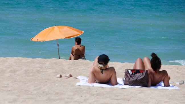 15 August 2020, Spain, Palma: Women sunbathe and swim on the beach of Arenal in Mallorca. In view of the increased risk of infection, the German government has classified almost all of Spain, including Majorca, as a risk area. The classification means that returning holidaymakers are required to test for the coronavirus. Photo: Clara Margais/dpa (Photo by Clara Margais/picture alliance via Getty Images)