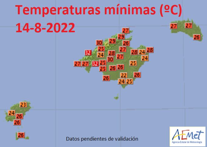La Agencia Estatal de Meteorología (Aemet) ha señalado que la noche del sábado ha sido la más cálida del verano en Baleares, con temperaturas mínimas de 32 ºC en Palma y Banyalbufar, 30 ºC en Sóller y Santa Maria, y 29 ºC en Pollença y en el aeropuerto de Son Bonet.