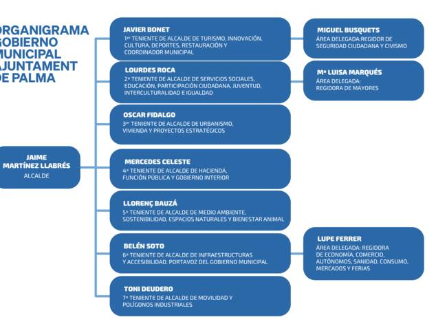 Palma pasará a contar con diez regidurías, son cuatro menos que en la anterior etapa del Pacte de la izquierda. El alcalde de Cort, Jaime Martínez, ha mostrado su plena confianza a los diez regidores del Consistorio. Un equipo de gobierno de Palma, paritario, con cinco hombres y cinco mujeres.