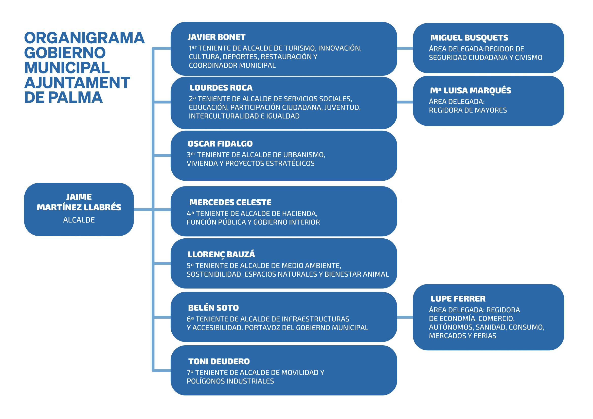 Palma pasará a contar con diez regidurías, son cuatro menos que en la anterior etapa del Pacte de la izquierda. El alcalde de Cort, Jaime Martínez, ha mostrado su plena confianza a los diez regidores del Consistorio. Un equipo de gobierno de Palma, paritario, con cinco hombres y cinco mujeres.