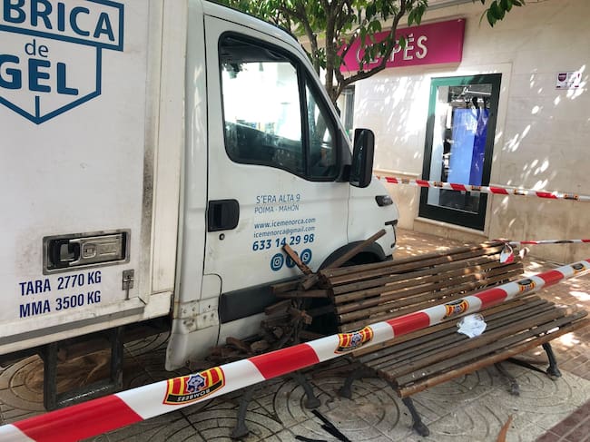 En fallar el fre de ma el camió va rodar sense control pel carrer de l'Infanta de Maó fins que va xocar amb el mobiliari urbà i es va aturar deixant pel mig dues persones ferides. / Manu Vilardell