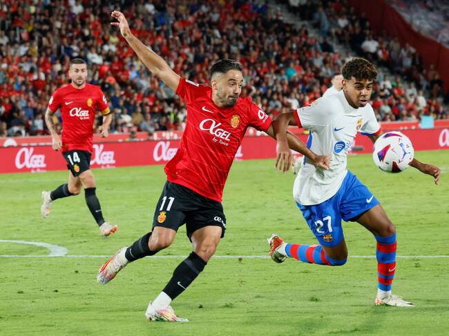 PALMA DE MALLORCA, 26/09/2023.- El delantero del Barcelona Lamine Yamal (d) pelea un balón con Jaume Costa, del Mallorca, durante el partido de la séptima jornada de LaLiga entre el RCD Mallorca y el FC Barcelona que disputan hoy martes en el estadio de Son Moix, en Palma de Mallorca. EFE/Cati Cladera / CATI CLADERA (EFE)