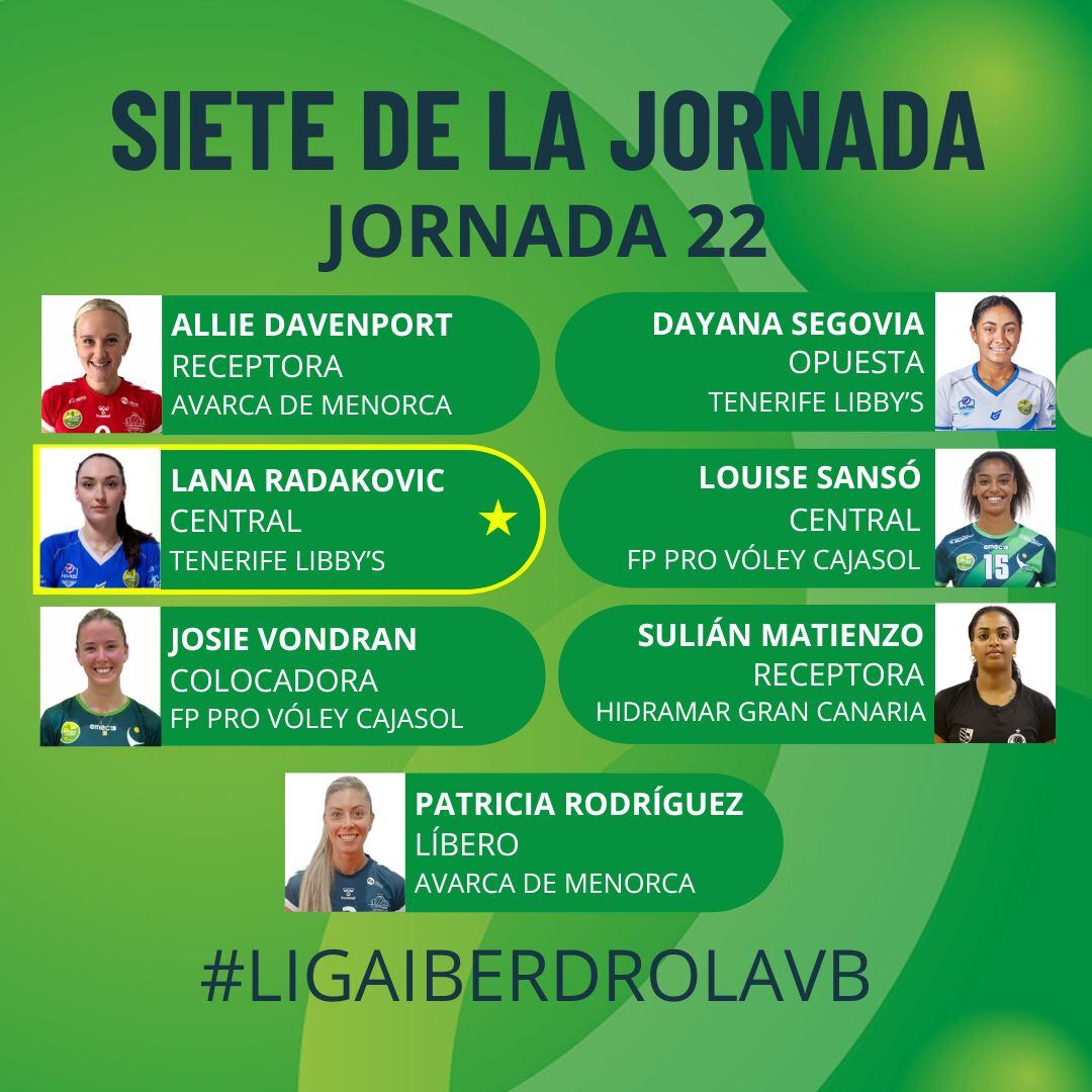 Dues jugadores de l’Avarca de Menorca han entrat en el darrer equip ideal de la fase regular que tria la Real Federación Española de Voleibol. Es tracta de la receptora Allie Davenport i de la lliure Patricia Rodríguez. La primera va sumar fins a 21 punts en el partit de dissabte contra el Sayre La Ballena mentre que la segona va tenir una eficàcia del 92% en les recepcions.