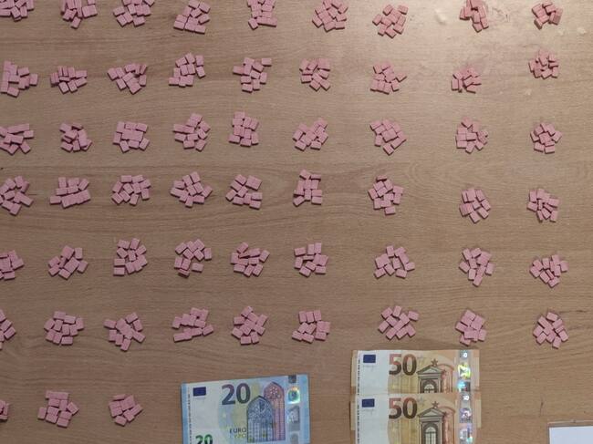 Tras revisar sus pertenencias, los agentes hallaron una bolsa que contenía novecientas veintiocho pastillas de color rosa, presumiblemente de MDMA.