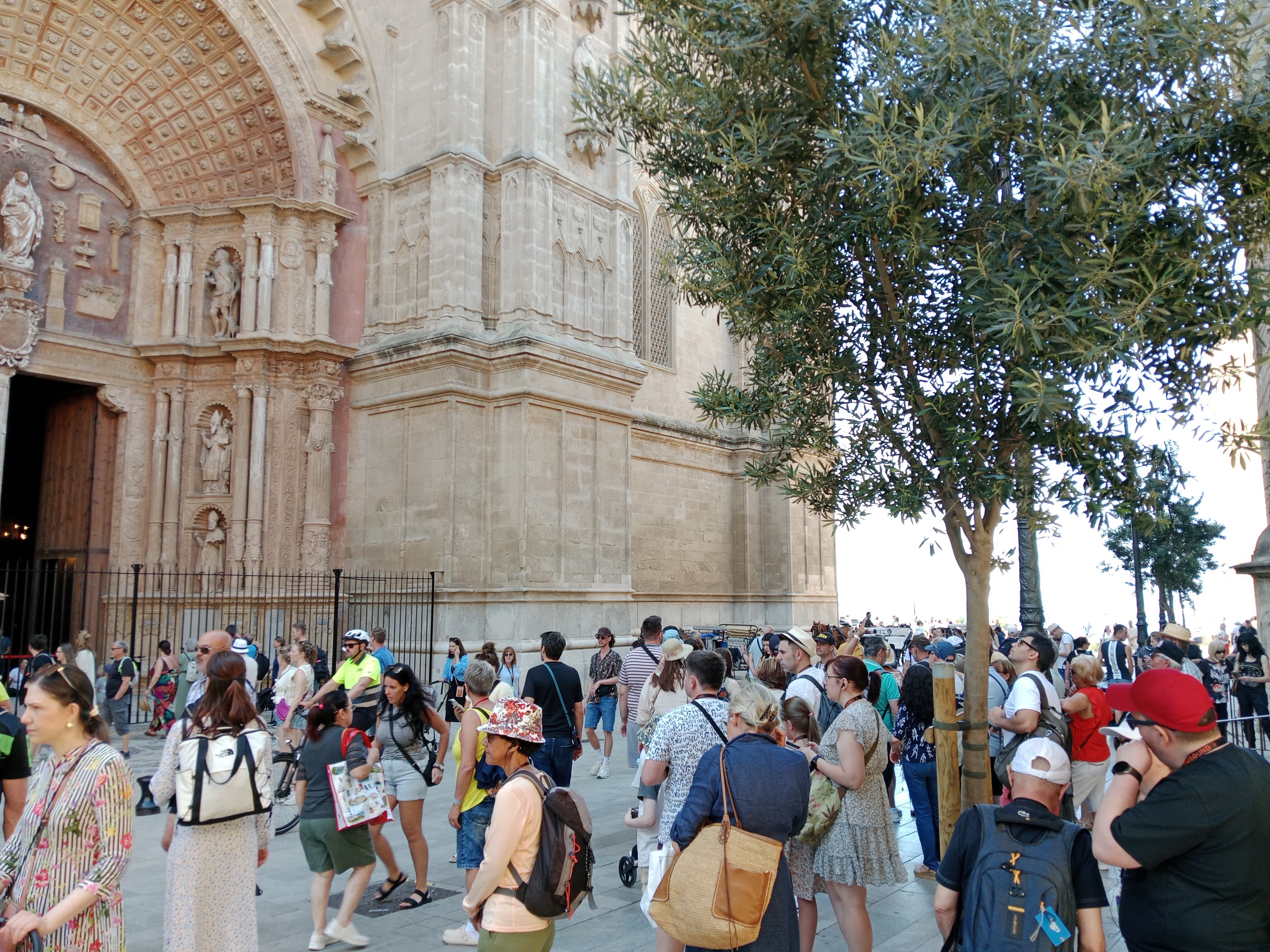 Ningún visitante se quiere ir sin haber paseado por la Catedral de Mallorca. Es el epicentro de los turistas, sobre todo de los que vienen a bordo de un crucero. Esta semana habrán atracado 11 de estas embarcaciones. Fue el martes el día en el que más, con tres cruceros y 6.500 pasajeros a bordo. Mucha gente, muchas fotos, pero poco gasto.