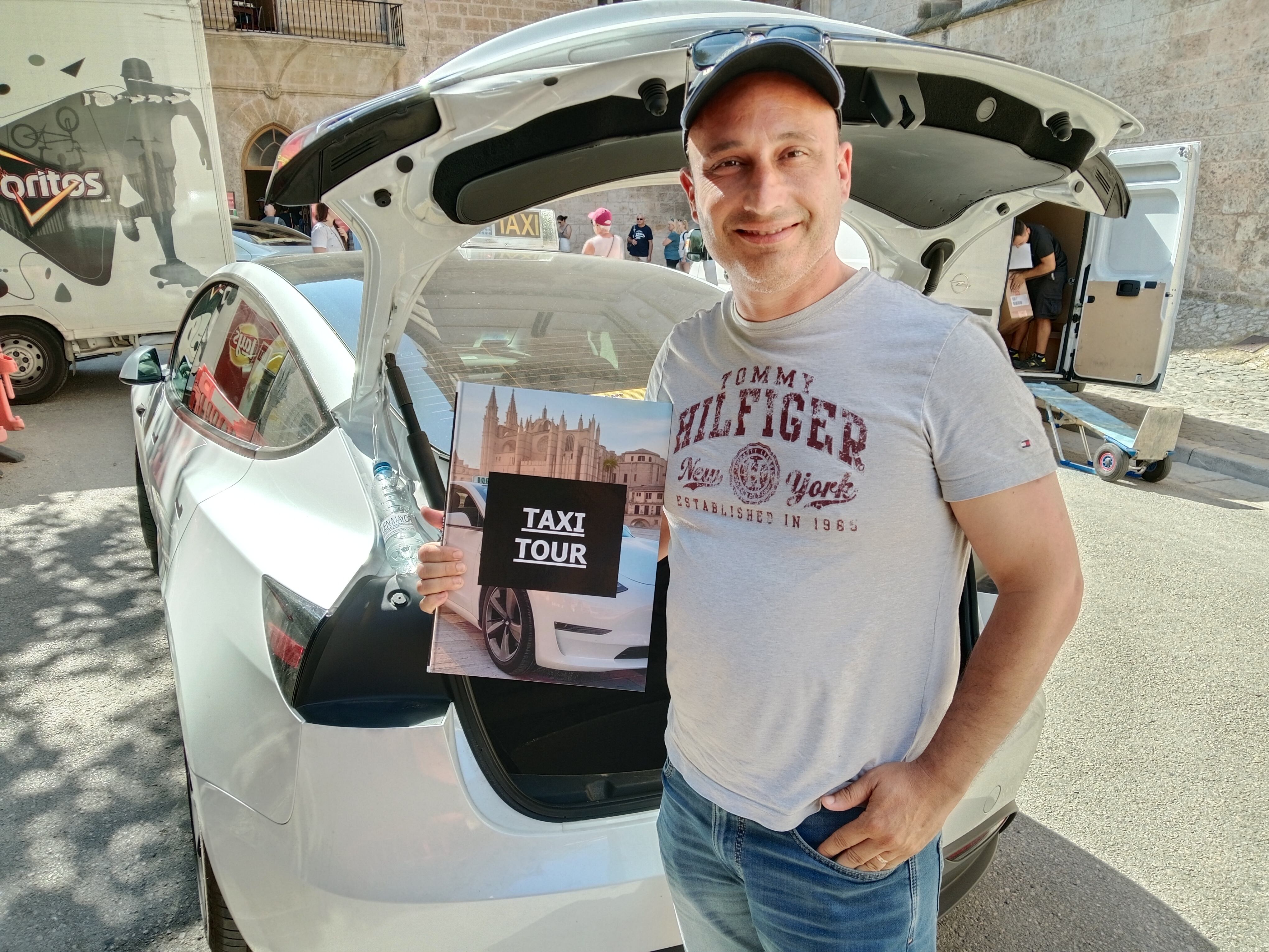 Así lo reconoce Santi Cuesta, es taxista especializado en ofrecer visitas guiadas a cruceristas. Les muestra incluso un álbum de gran tamaño diseñado con inteligencia artificial con las excursiones que ofrece. Espera a la sombra con su taxi eléctrico mientras el grupo de tres turistas contempla la Seu. Después se irán a Valldemossa. Un tour por el cual han pagado 150 euros.