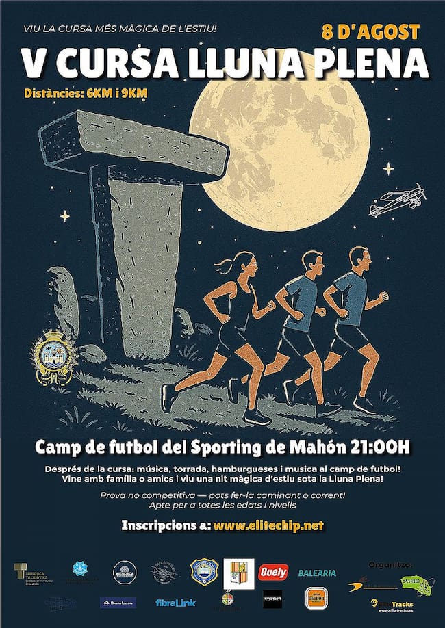 El 8 d’agost es disputarà una nova edició de la Cursa de la Lluna Plena que organitza Club Menorca Atletisme-Maó i Elitechip. La sortida serà el dia 8 a les 9 del vespre des del camp de futbol de Bintaufa on també serà la meta. Hi haurà dos recorreguts de 6 i 9 kilòmetres. Un cop més, la prova no serà cronometrada perquè el seu objectiu és la promoció de l’esport i no la competició.