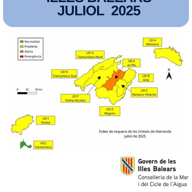 En cuanto a los escenarios de sequía, todas las unidades de demanda (UD) han registrado una bajada del índice: Menorca, Artà, Manacor-Felanitx, Migjorn, Es Pla, Palma-Alcúdia, Tramuntana Nord, Tramuntana Sud, Ibiza y Formentera. En este contexto, la UD Es Pla ha entrado en escenario de alerta, lo que evidencia un empeoramiento generalizado de la situación. Actualmente, solo el 1,6% del territorio (UD Formentera) se mantiene en situación de normalidad, mientras que el 88,2% se encuentra en prealerta y el 10,2% (UD Es Pla) en alerta.