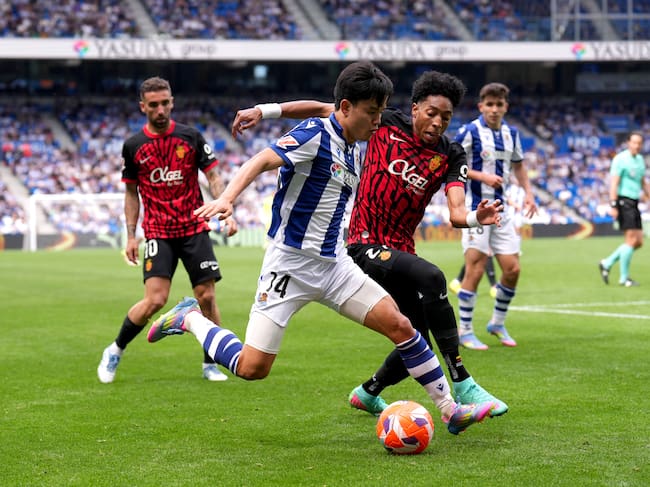 SAN SEBASTIAN, SPAIN - APRIL 12: Takefusa Kubo of Real Sociedad runs with the ball whilst under pressure from Johan Mojica of RCD Mallorca during the LaLiga match between Real Sociedad and RCD Mallorca at Reale Arena on April 12, 2025 in San Sebastian, Spain. (Photo by Juan Manuel Serrano Arce/Getty Images) / Juan Manuel Serrano Arce