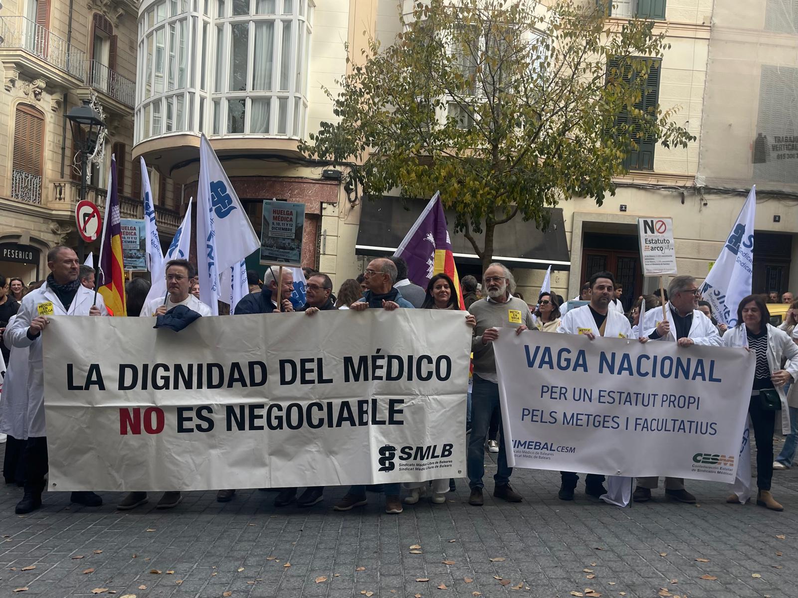 "La sanidad no se vende" o "Ministra dimisión" son algunos de los cánticos bajo los que un centenar de médicos se han concentrado esta mañana frente a la Delegación del Gobierno de Palma. Es la tercera de las cuatro jornadas de huelga convocadas contra el borrador del nuevo Estatuto de Marco.