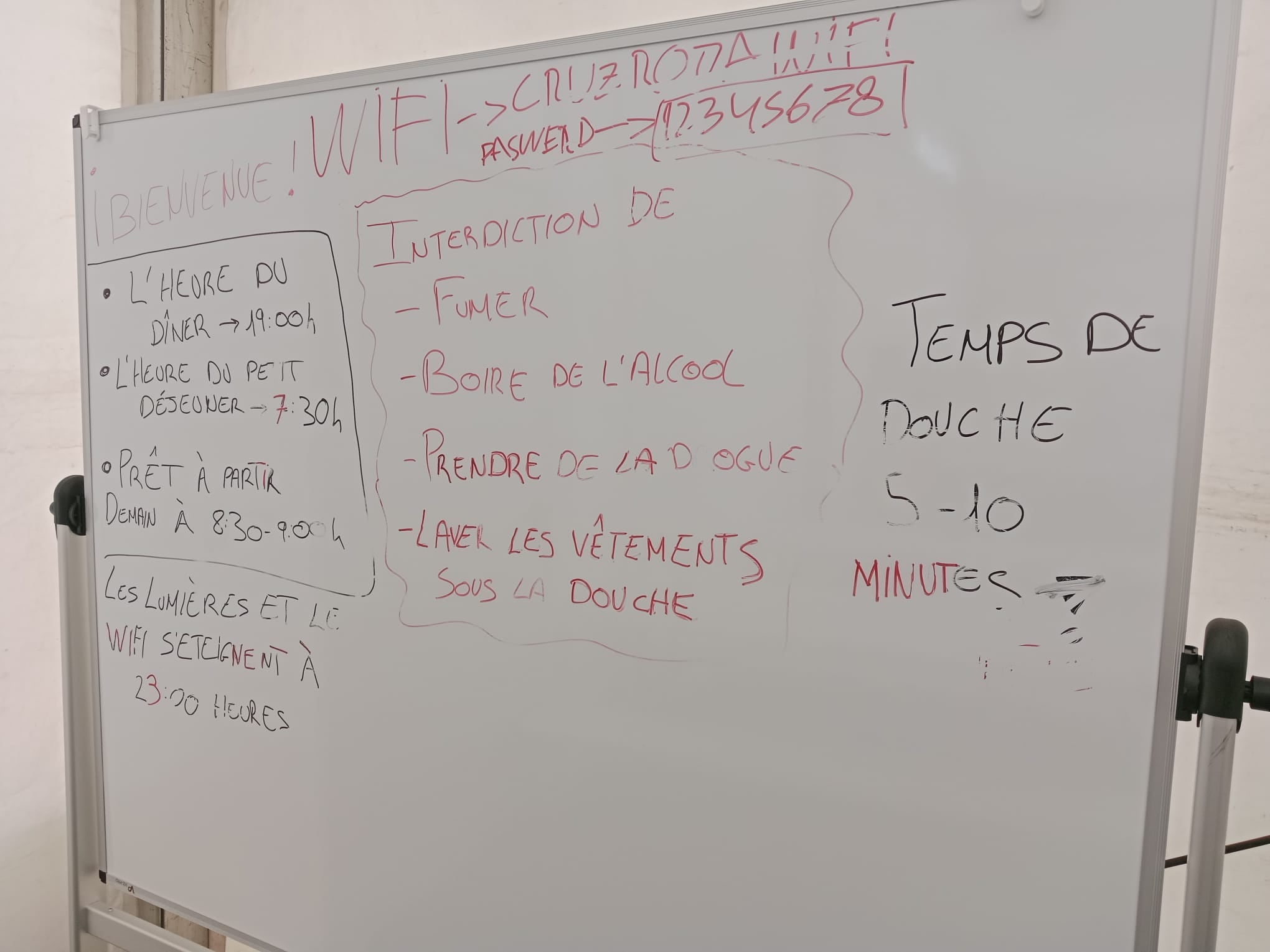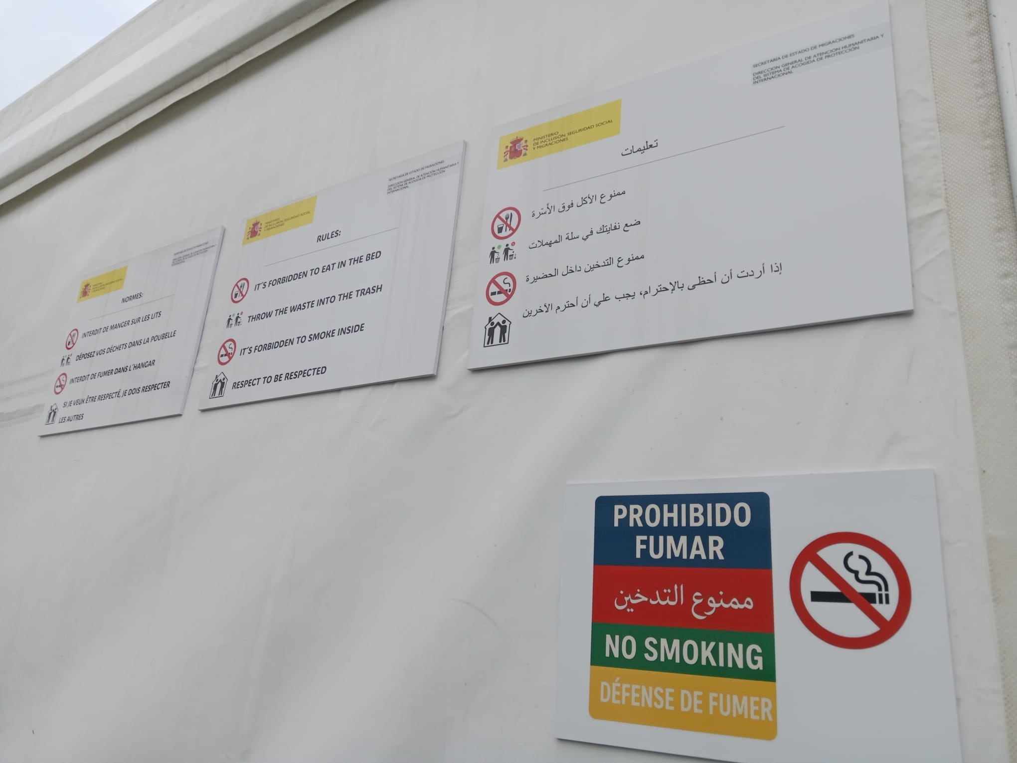 La cartelería se muestra en cuatro idiomas: castellano, inglés, francés y árabe. Los usuarios deben seguir una serie de normas básicas: el desayuno es a las siete y media de la mañana, y la cena a las siete de la tarde. Las luces y el wifi se apagan a las once de la noche, y las duchas no pueden durar más de 10 minutos.