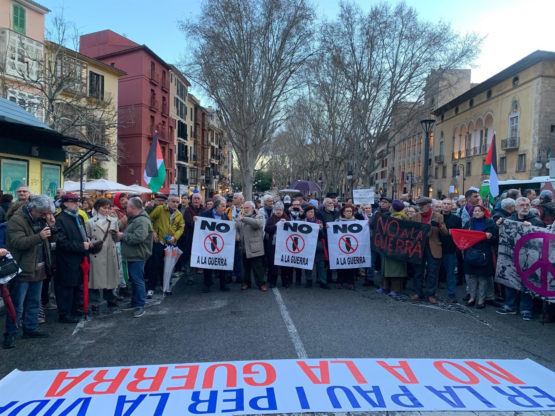 Bajo gritos de 'No a la guerra' y 'Ni OTAN ni bases', centenares de ciudadanos han reivindicado "la paz y la vida" en una protesta convocada por Mallorca per la Pau, Mallorca per Palestina y Marxes de Mallorca per Palestina.