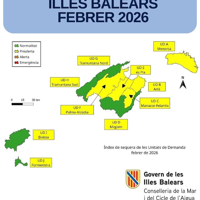 El 55,8% restante --Menorca, Artà, Manacor-Felanitx, Palma-Alcúdia y es Pla-- se encuentra en situación de prealerta. En consecuencia, no hay ninguna unidad de demanda en situación de alerta en todo el archipiélago.