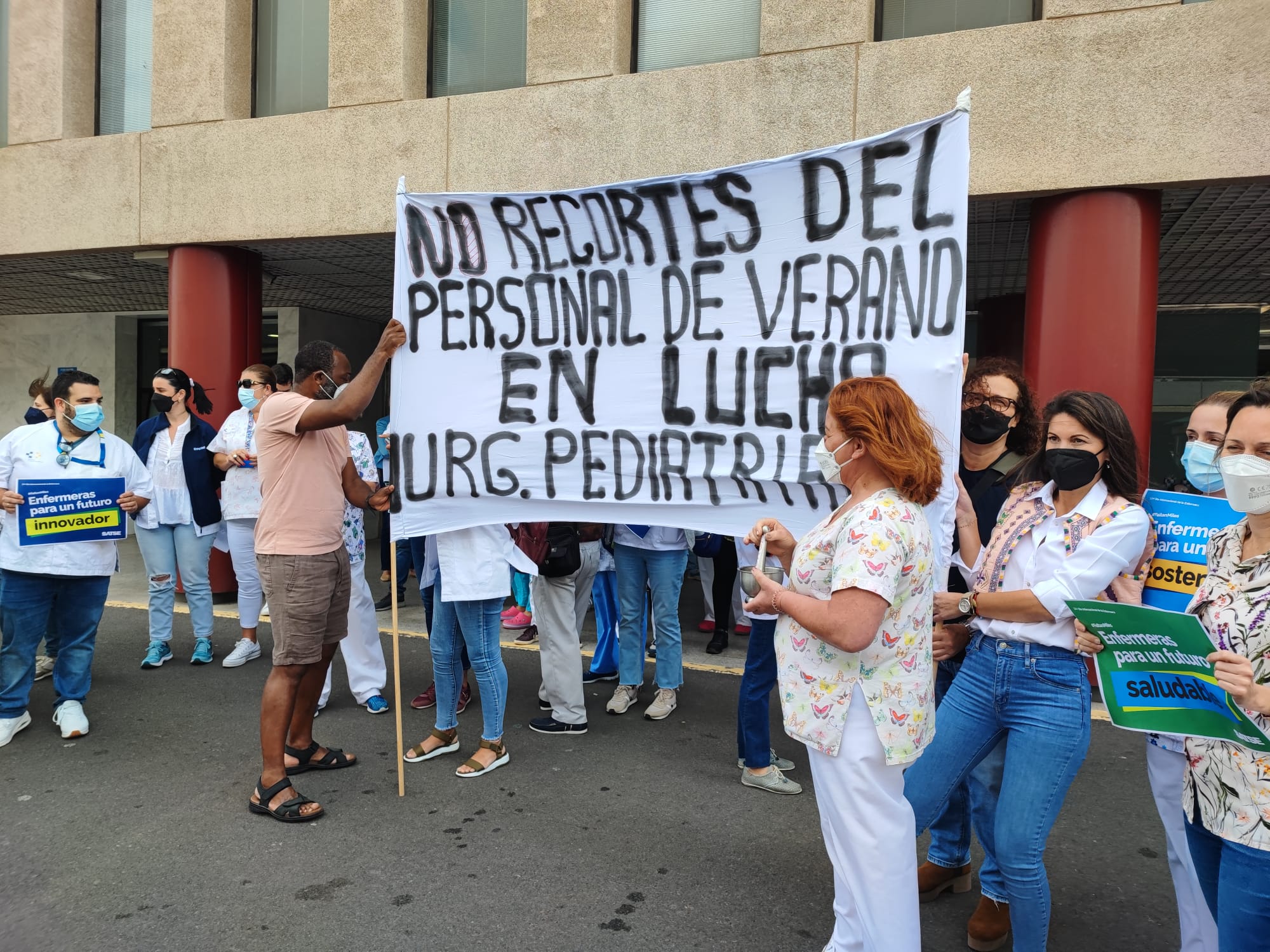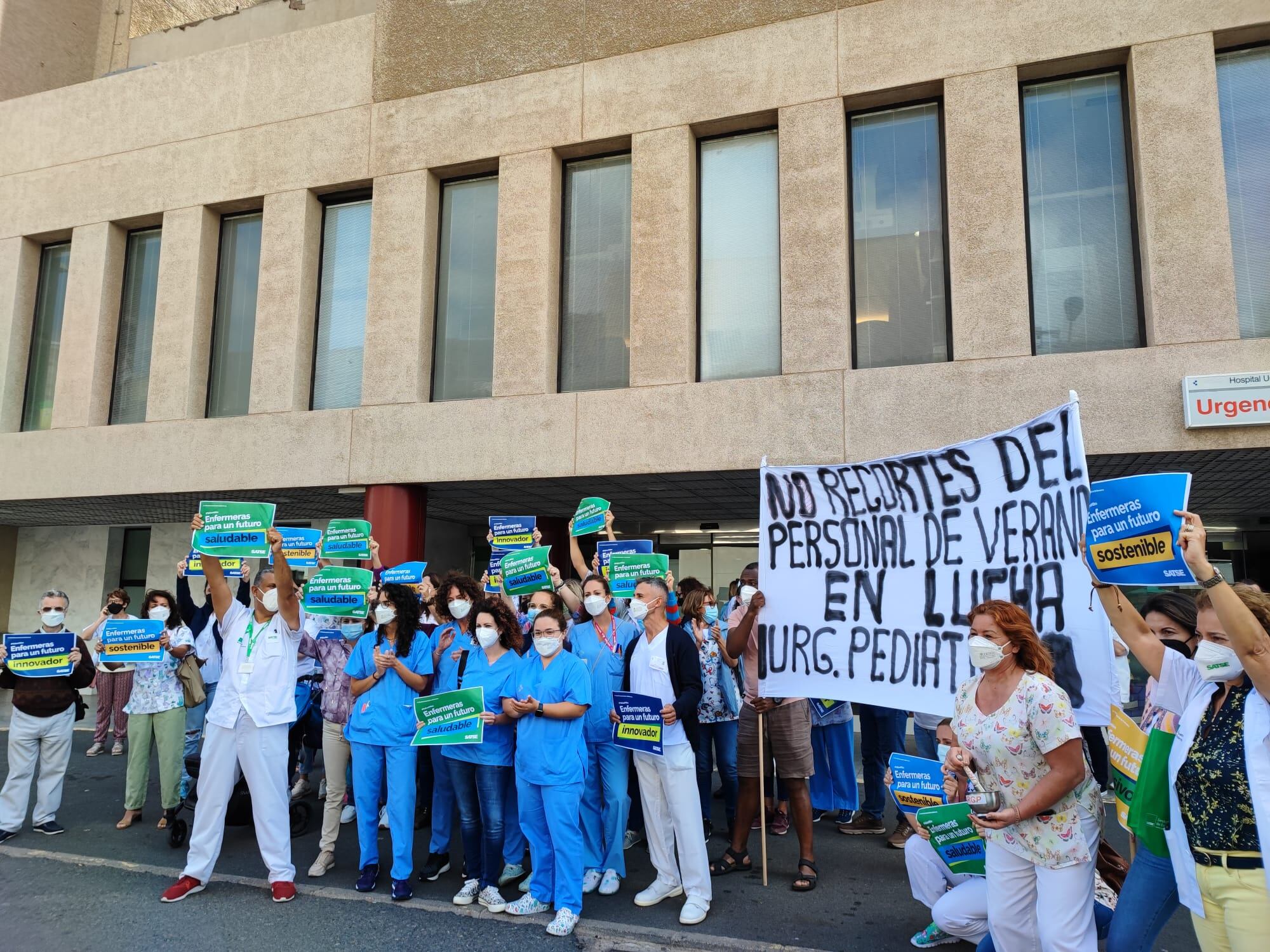 Actualmente la plantilla de enfermería de Urgencias pediátricas del Materno Infantil la componen once enfermeros y once auxiliares de enfermerías, que hoy como apoyo a las carencias laborales que presenta este colectivo de profesionales en Canarias, se ha sumado a la concentración celebradas en la puerta principal de dicho recinto en la que participaron más de un centenar de enfermeras para reivindicar en el Día Internacional de la Enfermera.