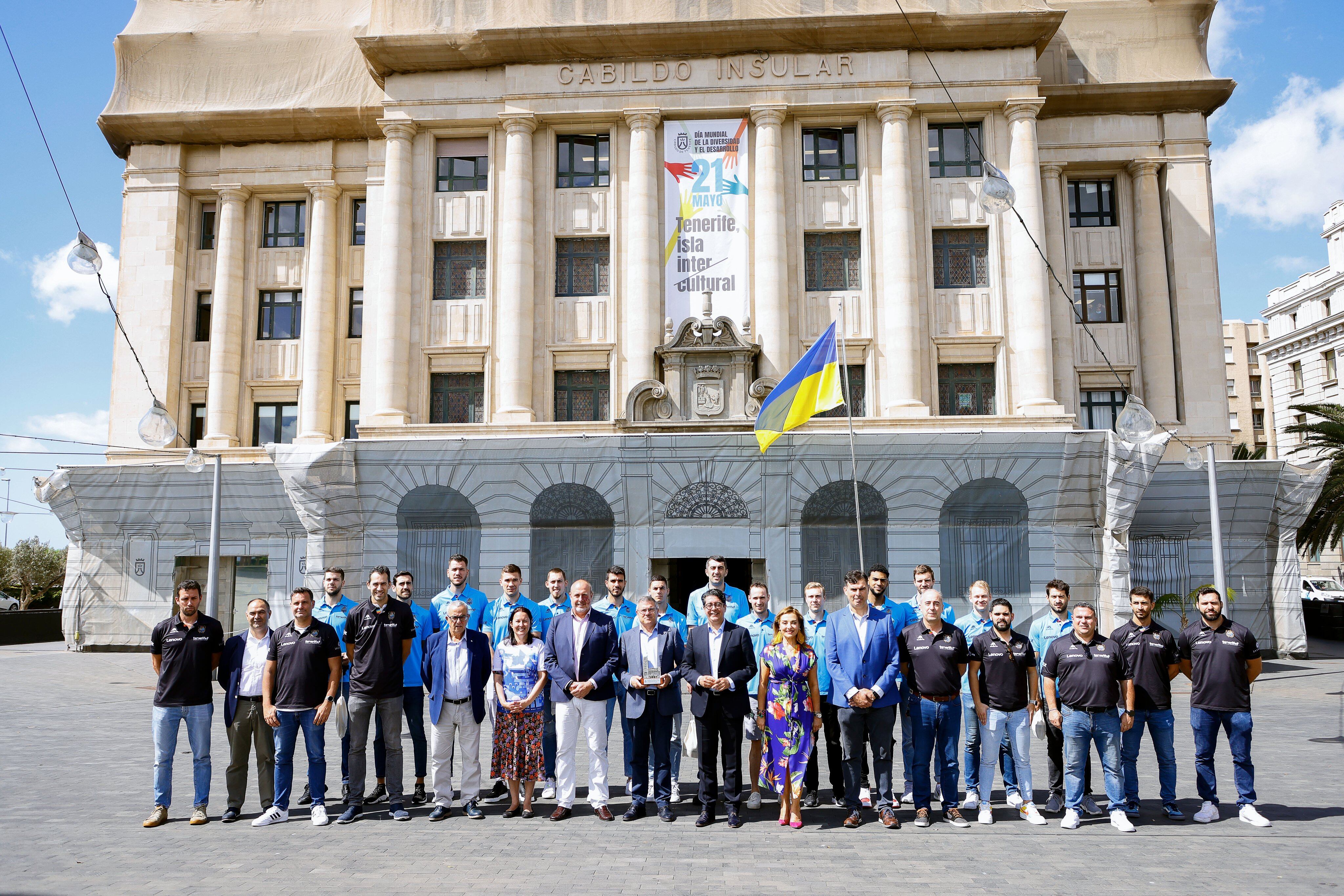 La primera plantilla, cuerpo técnico y directiva del CB Canarias, ha sido recibida este jueves por el presidente del Cabildo de Tenerife, Pedro Martín, en el salón noble de la corporación insular. Junto al vicepresidente, Enrique Arriaga, y la consejera de deportes, Concepción Rivero, el cuerpo técnico encabezado por Txus Vidorreta y la primera plantilla fueron felicitados por la gran temporada realizada en el equipo aurinegro.