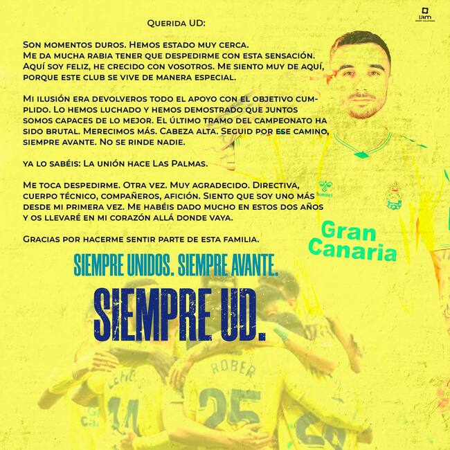 En su despedida el jugador lamenta no haber podido dar el ascenso al equipo, pero si ha enfatizado en la idea de que la fuerza del equipo estuvo en la cohesión que mostró durante la pasada temporada.