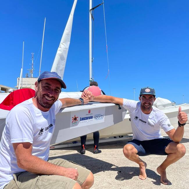 Los dos campeones lanzaroteños junto a su embarcación. / Cadena SER
