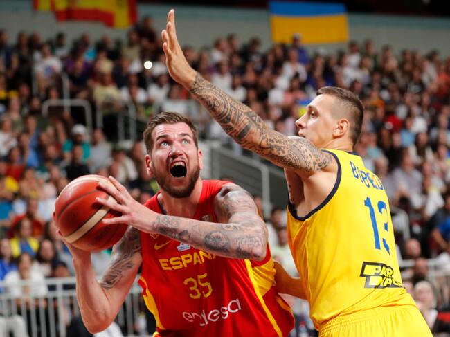 Riga (Latvia), 07/07/2022.- Ukraine's Vyacheslav Bobrov (R) and Spain's Fran Guerra in action during the FIBA Basketball World Cup 2023 qualifiers match between Ukraine and Spain at Arena Riga, Latvia, 07 July 2022. (Baloncesto, Letonia, España, Ucrania) EFE/EPA/TOMS KALNINS / TOMS KALNINS (EFE)