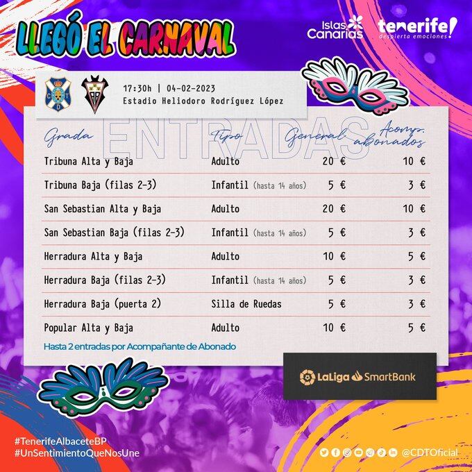 El sábado 4 de febrero a las 16:30 horas y frente al Albacete, volverá a contar con diferentes iniciativas para intentar crear el mejor ambiente posible en el Heliodoro Rodríguez López. Tras dos partidos consecutivos fuera de casa, en Cartagena y Santander, el conjunto blanquiazul volverá a jugar ante sus aficionados y la directiva que preside Paulino Rivero ha vuelto a idear una promoción para los abonados con entradas a mitad de precio. Hasta dos entradas podrá retirar el abonado blanquiazul.