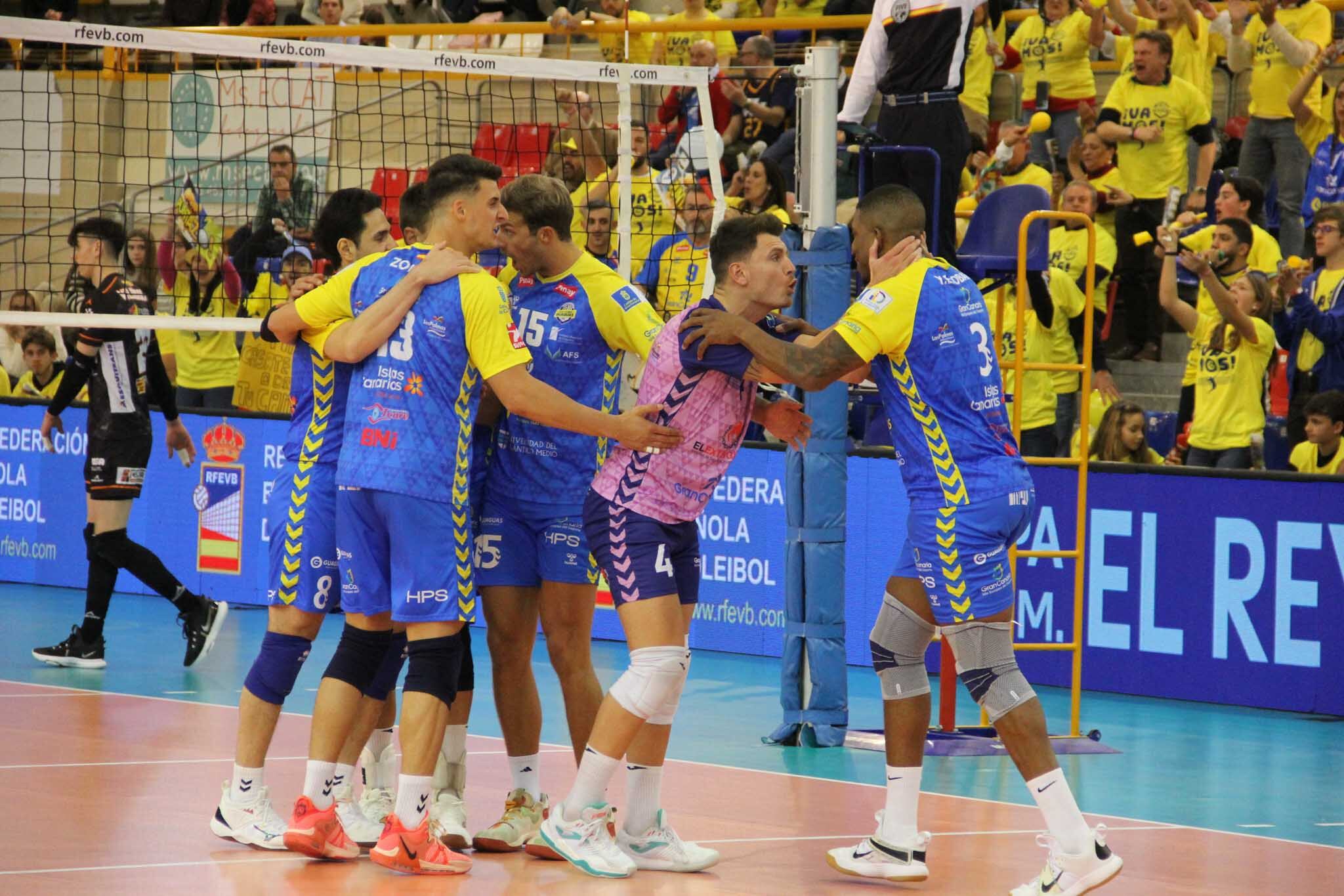 Saltaba la sorpresa y el Guaguas caía eliminado en el cuarto set La teoría decía que un partido largo favorecía a los de Camarero, pero en el torneo del KO todo podía pasar y los amarillos no tenían margen de error en el cuarto set, lo cual quedó patente desde el arranque del mismo; la grada amarilla era consciente de lo que se jugaban los suyos y no paran de animar y esa conexión se vio reflejada en la pista, sumada a la intensidad de Camarero desde la banda, poniendo el 4-7 en el marcador de Los Pajaritos. Los de Máximo Torcello no se despegaban y con 7-10, se pedía un nuevo tiempo muerto en pista. Yadrían Escobar seguía liderando la ofensiva canaria y ponía a los suyos +4 pero un error de comunicación en la defensa amarilla acercaba de nuevo a los de Teruel hasta que Borja Ruiz reventaba el balón para poner a los suyos 4 arriba nuevamente. Un error de Zonca ponía a 1 los turolenses y Sergio Miguel Camarero pedía un nuevo tiempo muerto, buscando la reaccionaron de los suyos que se ponían 17-20 tras 3 grandes ataques. El conjunto naranja no cedía en su empeño por matar el partido en el cuarto y un parcial de 5-0 les ponía por delante en el marcador (22-20). Boja Ruiz salvaba una bola de partido para el Teruel poniendo el 24-23 pero un remate de Vildósola ponía el 25-23 en el marcador eliminando así al CV Guaguas de la Copa de SM El Rey 2023.