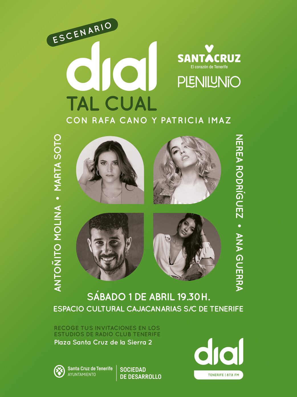 Por primera vez, Plenilunio Santa Cruz de Tenerife trae dentro de su programación un formato que presenta Cadena DIAL y la Sociedad de Desarrollo de Santa Cruz de Tenerife, dentro del programa del evento desarrollado en toda la ciudad. El Escenario DIAL TAL CUAL, es un formato inédito cuya línea editorial consiste en un encuentro y entrevista donde los asistentes pueden participar. Además, los artistas invitados actúan en formatos acústicos y muy cercanos. Este encuentro, presentado por la Sociedad de Desarrollo de Santa Cruz de Tenerife y Cadena DIAL, será a partir de las 19:30 horas en el Espacio Cultural Cajacanarias de Santa Cruz de Tenerife y las puertas se abrirán desde las 19:00 h. Estará presentado por el histórico locutor Rafa Cano y Patricia Imaz, presentadores del programa nacional de música en español más escuchado de los fines de semana Dial Tal Cual.
