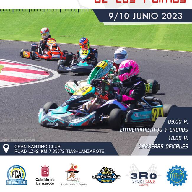 La segunda prueba del Campeonato de Canarias de Karting y primera de la Provincia de Las Palmas aterriza este fin de semana en el Gran Karting de Lanzarote. La competición cuenta con 30 participantes inscritos que correrán a lo largo de los 1.400 metros de la pista lanzaroteña. En la menor categoría la MICRO los mas jóvenes que se inician habrá cuatro pilotos, siete en categoría MINI, cinco en JUNIOR, uno en SENIOR, siete en la DD2 y seis en la categoría KZ. Las dos últimas se disputan a bordo de karts con cambios.