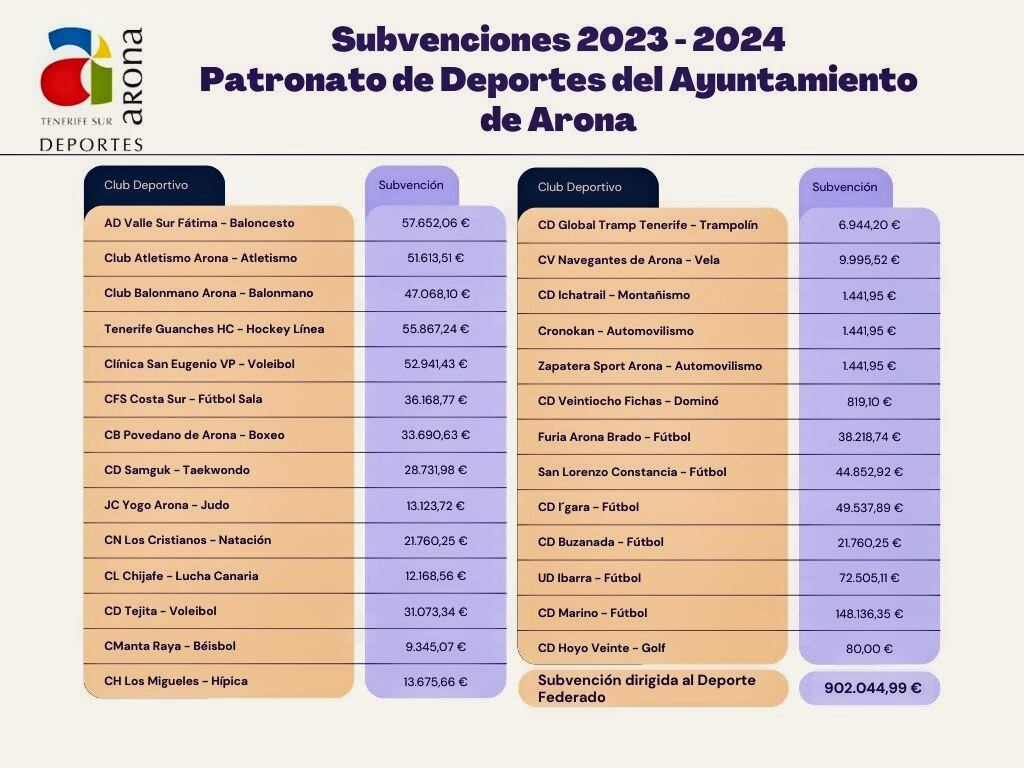 El Ayuntamiento de Arona, a través de su Patronato de Deportes, ha asignado una inversión significativa de novecientos dos mil cuarenta y cuatro con noventa y nueve euros (902.044,99), destinados a fortalecer y respaldar el deporte municipal durante la temporada 2023-2024. Esta iniciativa busca garantizar que los clubes deportivos de Arona dispongan de los recursos necesarios para sus proyectos y actividades.