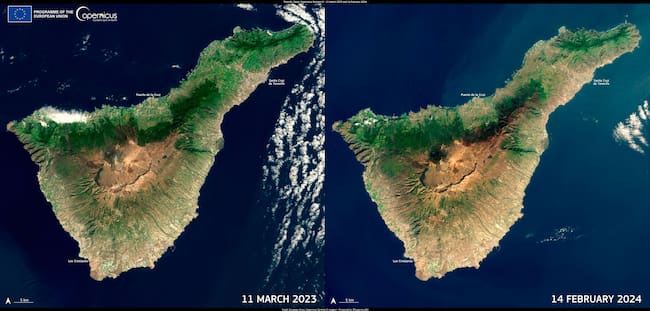 GRAFCAN6131. SANTA CRUZ DE TENERIFE (ESPAÑA), 04/03/2024.- El sistema europeo de satélites Copernicus ha difundido este lunes esta imagen de Tenerife que muestra cómo la cobertura de verde de la isla ha retrocedido en el último año tras uno de los inviernos más secos de su historia, lo que ha llevado a su Cabildo a poner en marcha la declaración de la emergencia hídrica, con medidas de restriciones. EFE/Copernicus / SOLO USO EDITORIAL/SOLO DISPONIBLE PARA ILUSTRAR LA NOTICIA QUE ACOMPAÑA (CRÉDITO OBLIGATORIO) / Copernicus (EFE)