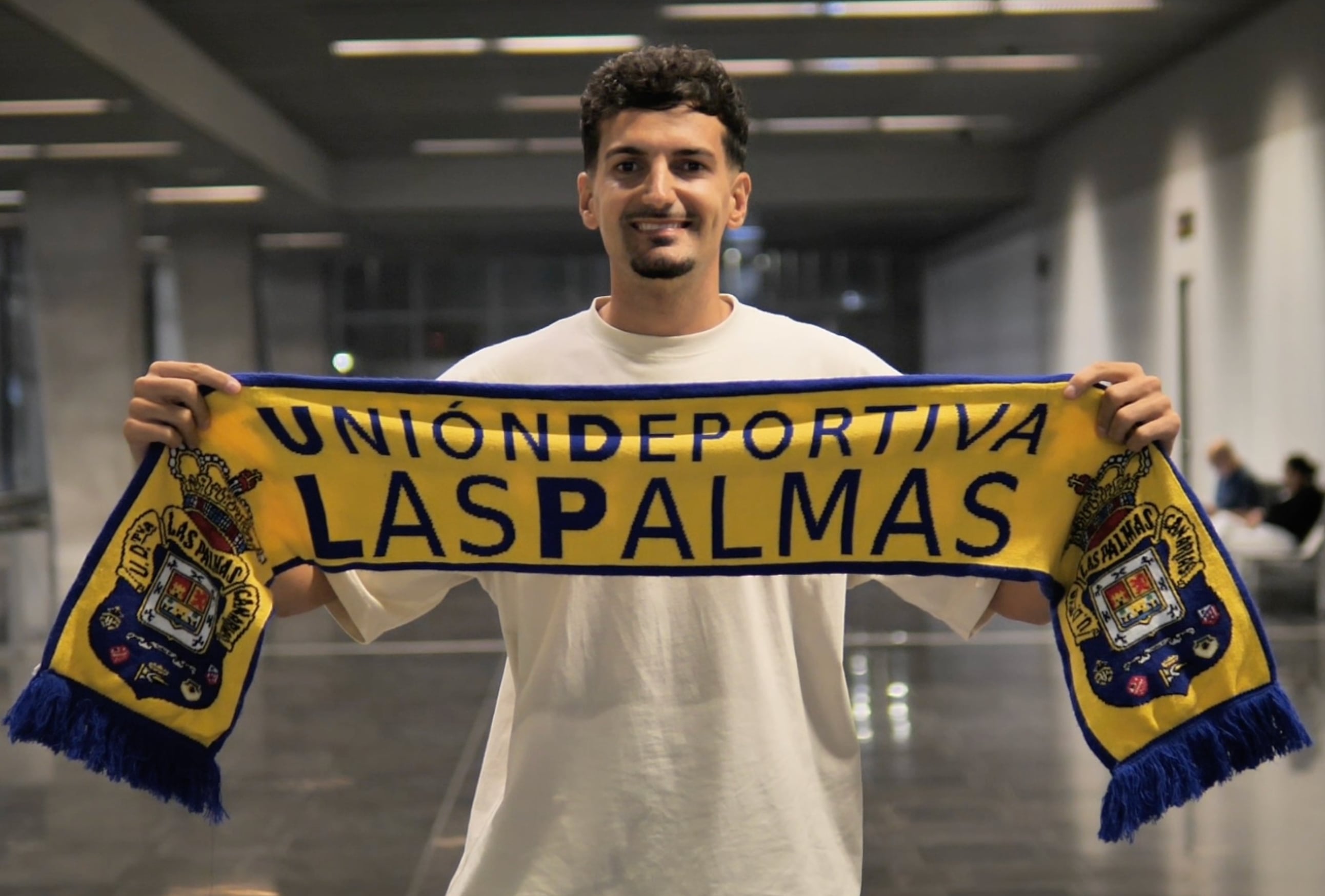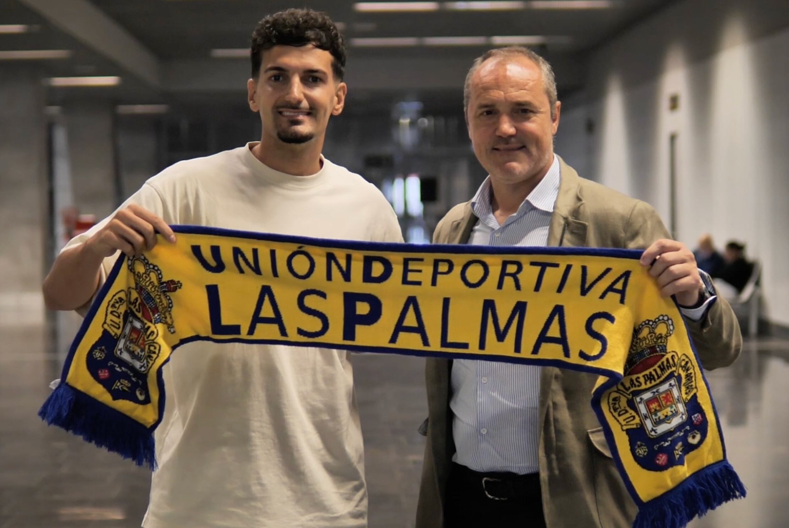 El lateral zurdo Alex Muñoz ya aterrizó en Gran Canaria para pasar el reconocimiento médico como nuevo jugador amarillo, siendo recibido por el director deportivo de la Unión Deportiva Las Pamas, Luis Helguera.