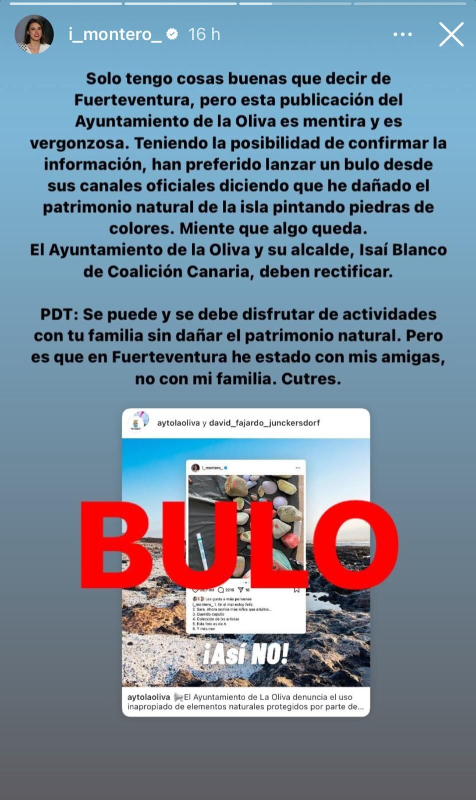 A través de un comunicado, el consistorio ha manifestado "su profunda preocupación ante las recientes publicaciones en redes sociales de la exministra de Podemos, Irene Montero en las que se observan elementos naturales, tales como piedras y conchas pintadas. La actual eurodiputada, Irene Montero, muestra en su perfil de Instagram estas piezas naturales que, podrían ser recogidas de playas de Fuerteventura, manipulados y convertidos en elementos decorativos. Así pues, esta acción va en contra de la normativa vigente de protección del patrimonio natural".