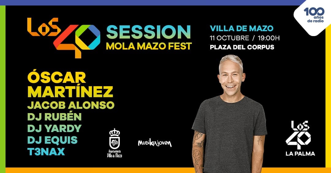 El Ayuntamiento de Villa de Mazo acoge la segunda edición el viernes, 11 de octubre, de ‘Los40 Session Mola Mazo Fest’, que contará con una impresionante alineación de DJs de renombre local a través del promotor Musikajoven. El festival, que tendrá lugar en la Plaza del Corpus Christi, a partir de las 19:00 horas, promete ser una jornada inolvidable para los amantes de la música electrónica y los ritmos más actuales, con la participación estelar de Óscar Martínez, presentador de Los40, junto a los reconocidos DJs palmeros como Jacob Alonso, DJ Rubén, DJ Yardy, DJ Equis y T3nax.