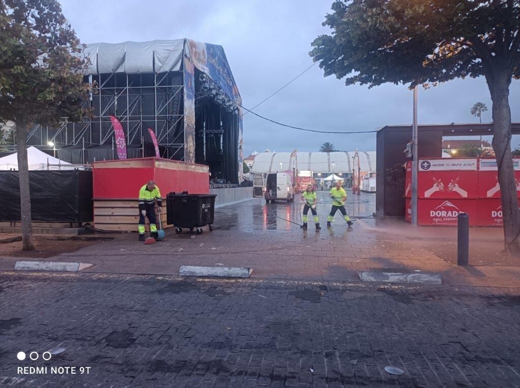 Tras la finalización de las fiestas, una vez levantadas todas las instalaciones de carácter provisional, se han realizado labores exhaustivas de limpieza en toda el área festiva, procediendo a la total eliminación de manchas y residuos que quedaron en la vía pública.