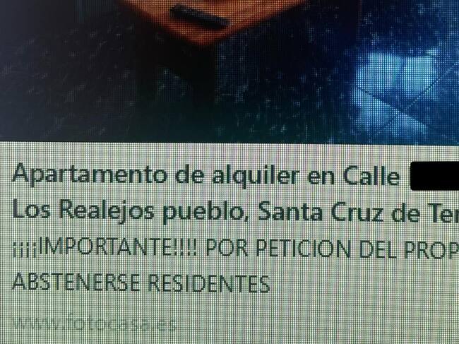 "¡Importante! Por petición del propietario, abstenerse residentes". Es el mensaje que se podía leer hasta este lunes en el anuncio de un piso en alquiler en Tenerife, en el municipio de Los Realejos. Tras el revuelo generado en redes sociales, la indignante oferta publicada en el portal Fotocasa ha desaparecido. El apartamento en cuestión, de 70 metros cuadrados en total, se alquilaba por 700 euros.