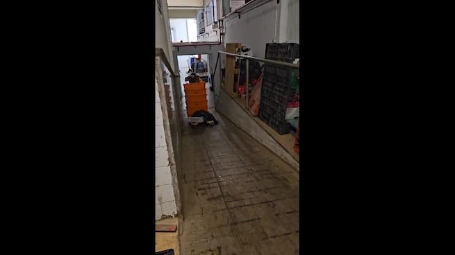 Uno de los principales problemas denunciados es la inoperatividad de los montacargas. Según explican varios empleados, llevan más de dos años sin que estos equipos funcionen, lo que obliga a cargar y descargar mercancía manualmente por una rampa. Esta rampa, originalmente más ancha, fue reducida con la llegada del supermercado valenciano, y ahora comparte espacio con una escalera de emergencia que permanece bloqueada por cajas. A ello se suma que la rampa se encuentra frecuentemente mojada por los residuos de la zona de pescadería, aumentando el riesgo de caídas.