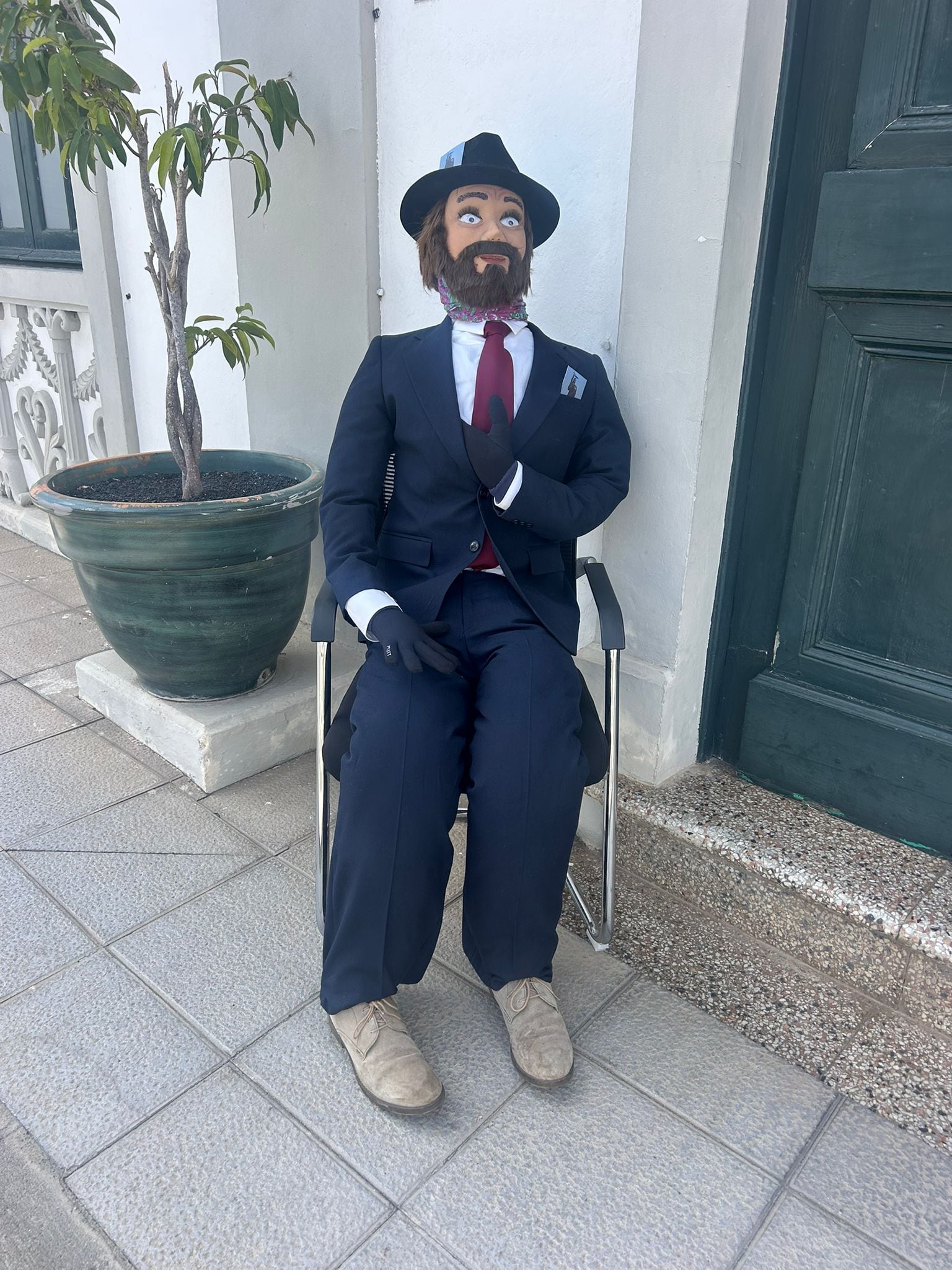 Este año, el muñeco luce especialmente elegante, vestido con una chaqueta azul marina y un traje de boda con más de 50 años de historia, cedido por un vecino.