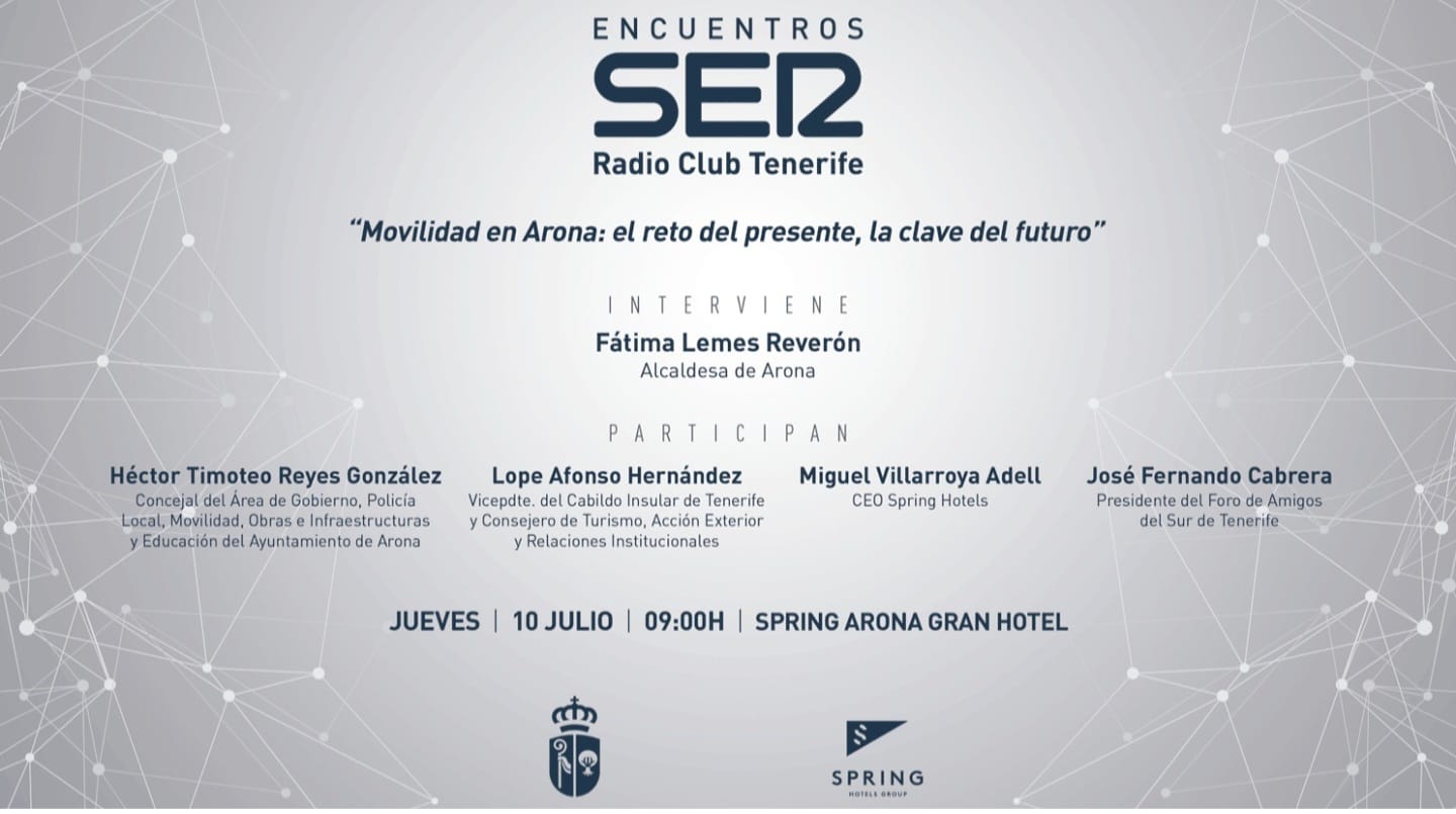 Este jueves 10 de octubre, desde las 9 de la mañana, Arona acoge un nuevo encuentro SER-Radio Club Tenerife sobre los retos en materia de movilidad a los que se enfrenta el municipio turístico del sur de Tenerife. Desde el Spring Arona Gran Hotel, se debatirá sobre las infraestructuras y las mejoras en el transporte de carretera.