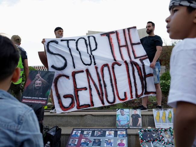 BUCHAREST (Romania), 31/08/2025.- People take part in a demonstration in support of Palestinians, in Bucharest, Romania, 31 August 2025. Palestinian refugees and human rights activists in Romania mobilized in solidarity with the Palestinian people and to protest Israels offensive in Gaza. (Protestas, Rumanía, Bucarest) EFE/EPA/ROBERT GHEMENT / ROBERT GHEMENT (EFE)