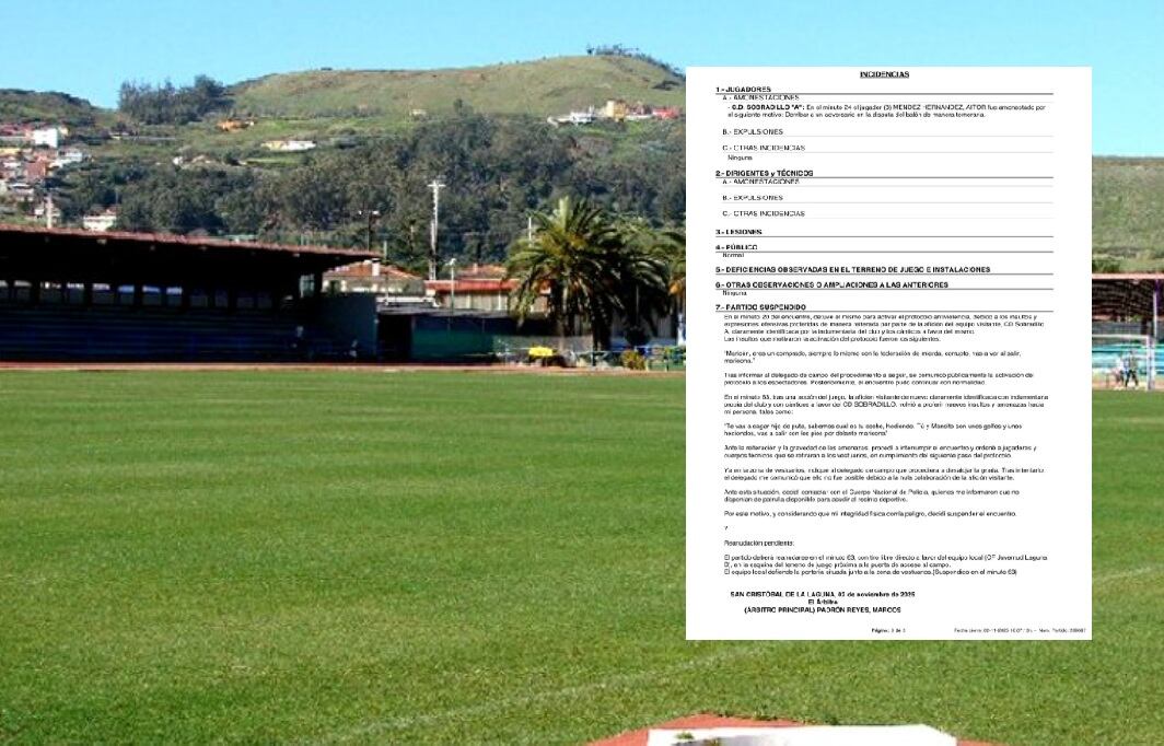 El árbitro de un partido de cadetes se vio obligado a activar el protocolo antiviolencia y, a continuación, parar el partido Juventud Laguna B-Sobradillo, que se disputaba este fin de semana en el Anexo al Francisco Peraza. Una vez más, el club presidido por Manolo Jara -el controvertido presidente ha sido suspendido y en esta ocasión no estaba presente en el campo- vuelve a protagonizar un incidente lamentable, que en esta oportunidad, además, aconsejó al equipo arbitral solicitar la presencia del Cuerpo Nacional de Policía.