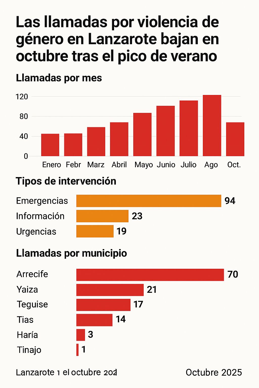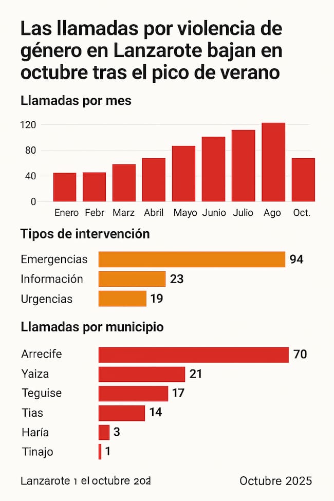 Hasta octubre de 2025, Lanzarote ha registrado 1.311 llamadas, con un crecimiento progresivo durante los meses de verano. Los meses de julio (135), agosto (163) y septiembre (174) concentraron los picos más altos, coincidiendo con la temporada turística y periodos de mayor convivencia doméstica.